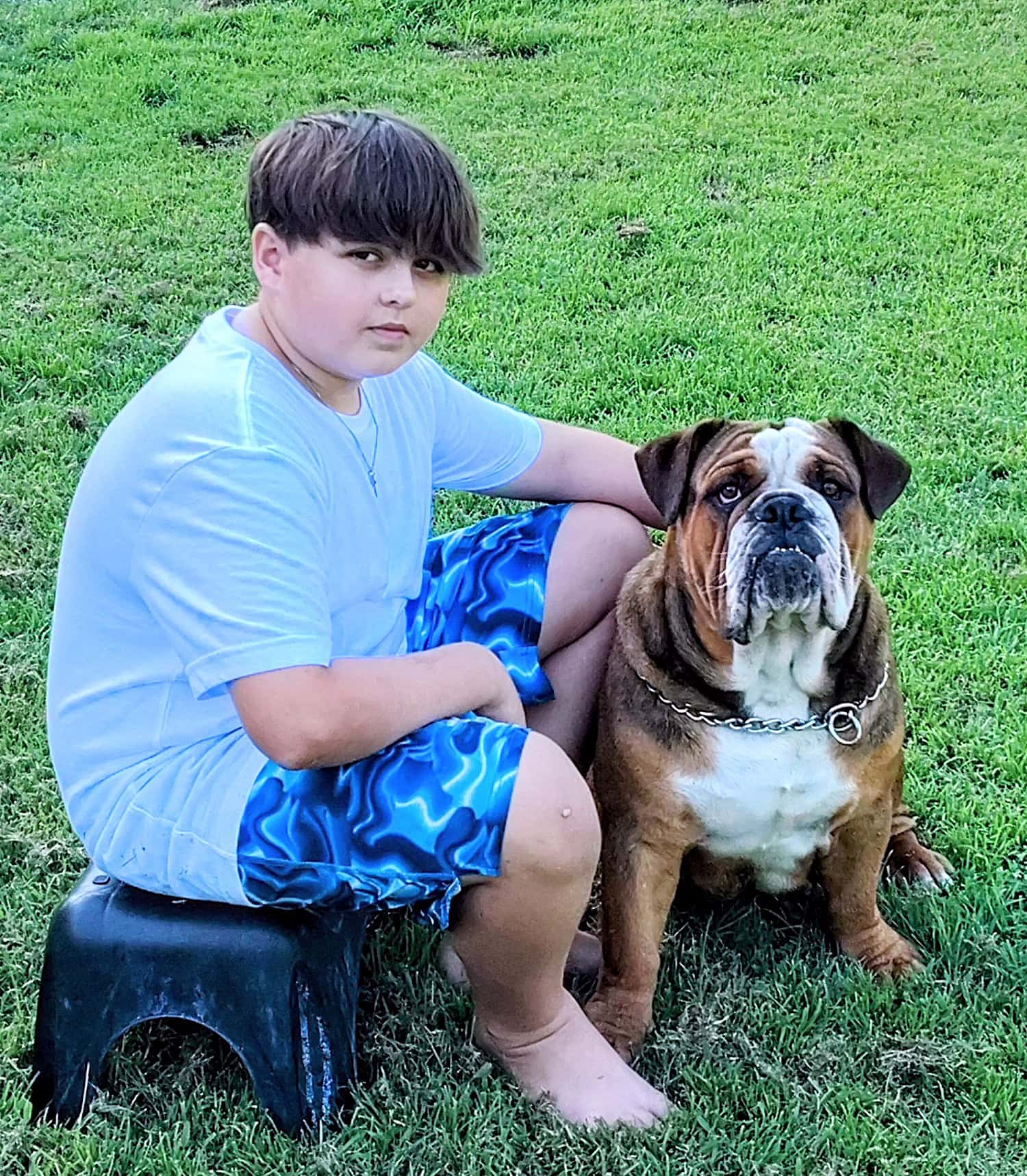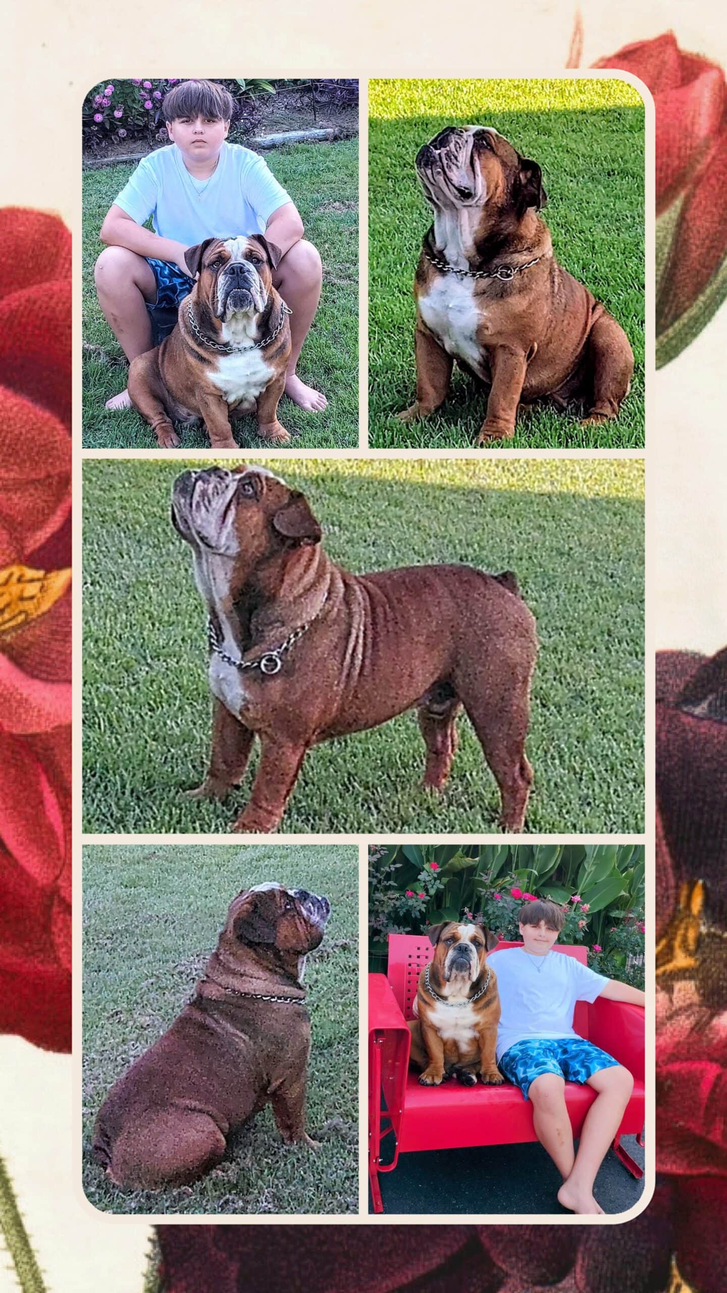 Born and raised right here, Amos was too beautiful - we had to keep him for our program! That deep red sable coat with bright white accents proved to be icing on his perfect structure! His sweet nature got us from the beginning - he'd skip a meal rather than pass up the human touch. He loves swimming and playing with our grandsons more than any activity. The muscle tone and thick bone on this boy are amazing. He's built just the way we love an Oldie. He is registered as "Blue Ribbon" Olde English Bulldogge with the IOEBA. We're so proud of this boy. 2026 will be his year to shine!