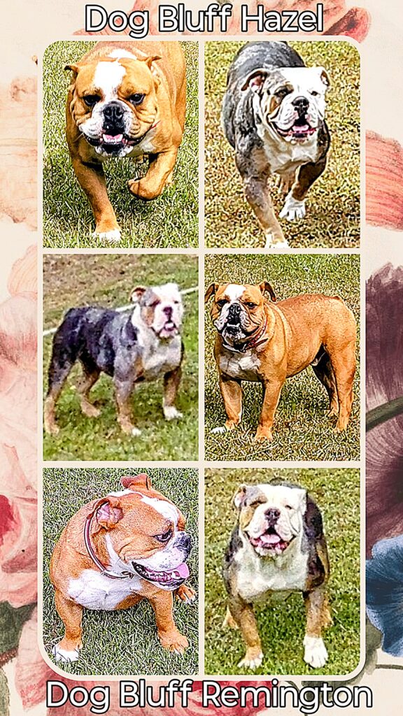 HAZEL x REMINGTON: Both are Dog Bluffers! Hazel dazzled us from birth with her blue-tri merle coat. Then she wow’d us with structure and wonderful temperament. She weighs 55-60lbs. We chose Remington for his structure, and coloring was a bonus! These two are very playful, muscular, stocky Oldies with very bully headpieces and great temperaments. They have enough “leg” to be extremely athletic – both can fly across our farm with ease. PUPPIES will be medium-sized.